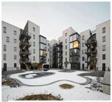 En esta misma categoría la promoción Vallecas ha recibido un accésit. Son 46 pisos protegidos en Villa de Vallecas diseñados por el estudio de arquitectos Untercio. El inmueble combina diferentes volúmenes que juegan con los espacios y las alturas, y en el que los salones de las viviendas se abren como cubos acristalados al jardín interior de la promoción, lo que garantiza iluminación natural y la posibilidad de abrirlos en verano creando un salón-terraza.